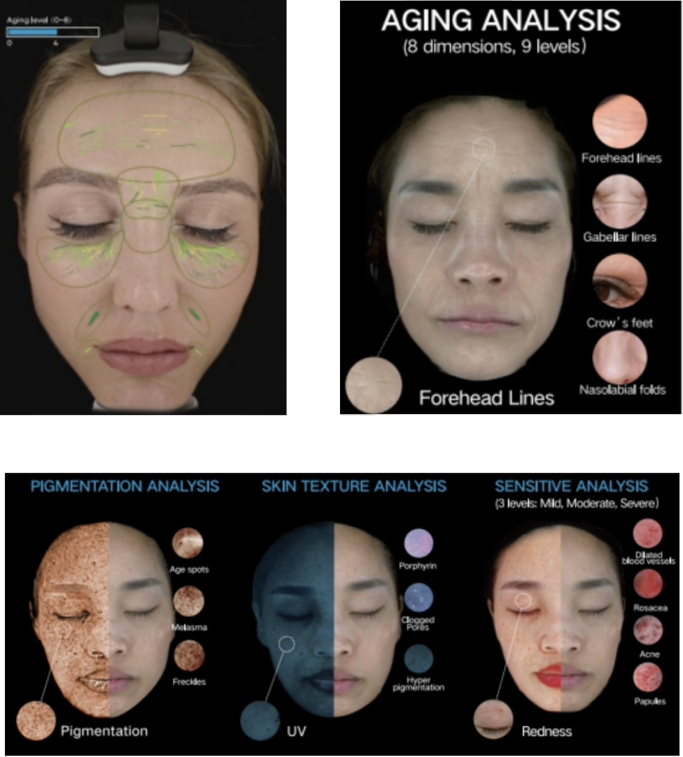 Detección única del envejecimiento, la sensibilidad, pigmentación, la textura y el tono de la piel